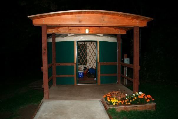 An executive decision was made to retire to the yurt for the night to play poker and watch a movie on un laptop de artsy bitch. And drink beer. We started watching 1408...it blew. A side effect of beer drinking though, is the constant need to...ya know, take a piss. I was waaaay too lazy to actually step off our deck and walk over to a tree, so I pissed off the side. After finishing up, I turn around to come back inside and observe...