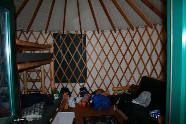 I opened a beer approximately 11 seconds after we got there. Go Keystone Light! I was stuck with the top bunk in this yurt, even after explaining that my manatee-like body could collapse the thin piece of plywood seperating me from Jess, who was sleeping below. My logic was veto'd.