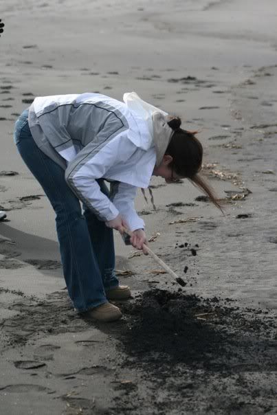 Saturday started off nicely enough. Cold but dry weather meant a trip to the beach with the ladies. Jamie proved she's from the interior by asking such deep philosophical questions such as "What are shellfish?" and trying to dig for clams with a stick. You don't believe me? Here, see for yourself: