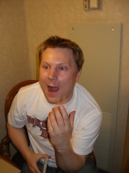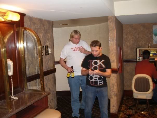 After hours and hours of booze and gambling, we were close to done for the night. Around 3 something AM, we went to the deli to get food. Jim and I got ours and sat at a table back out in the walkway area. There were still people everywhere. Randomly, 2 guys start yelling at each other, like 10 feet from us. One pushes the other...and that guy throws a punch. Slick guy ducked it, grabbed onto him, and threw him down. For some reason, I yelled out "JUDO THROW! TWO POINTS!" which made everyone, including the guys IN the fight, look at me. Oops. Luckily, they had better things to do, and continued fighting. Jess RAN outta the Deli, yelling "FIIIGHT!", which was pretty funny. After a couple more judo throws and a couple punches, one guy quit and walked away. The whole thing probably lasted 90 seconds. It was awesome.