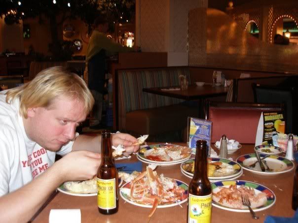 We found beers quickly, and checked out our hotel and the 2 connected to it. After a couple margaritas, we decided to venture out onto "the strip". All I can say is....wow. It's the fucking hood. We stopped at a couple of small casinos for beers along the way, and made fun of the locals. We only saw a couple of people getting arrested that time. Eventually it was back to the hotel for more booze, and...the buffet! No, it was not my idea assholes. Anyways, they had a seafood buffet for like 15 bucks, and I was determined to clean out a small seafull o' critters. I think I ate the legs of approximately 9 shellfish...while drinking 3 beers at the same time. Here, just for yourself: