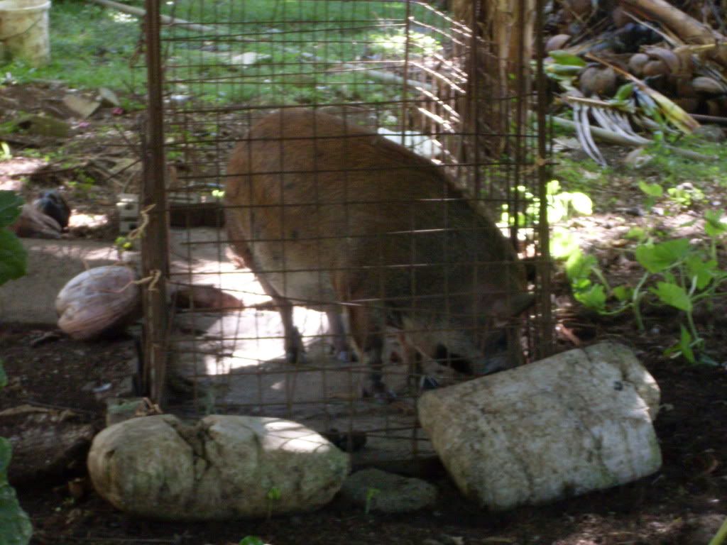 Back to town, used the net, had a couple and some lunch, and got psyched for stage 2 - Pig vs. Pig, round 2. I walked up the same street, this time on the grass skirting it so I wouldn't give myself away. Anyone watching me surely would have thought I was retarded while I crept up to the bushes and slowly peeked around the corner...and didn't see anything. No animals at all. YES! I started up the hill and got about 100 feet or so, when I heard a very familiar noise. Grunting. FUCK. I froze in my tracks, ready to book it once again, but after a few seconds I realized it wasn't angry grunting, just...regular? grunting. So I kept going. Not long after that, I found out why he didn't charge me. He was in a fucking cage!