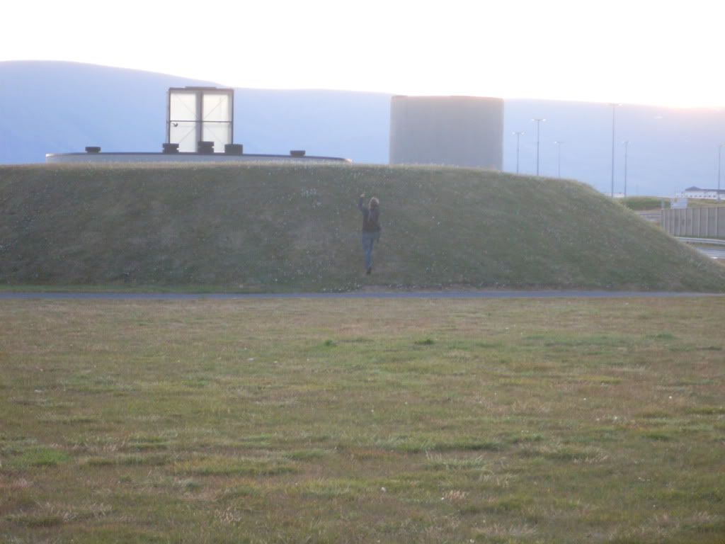 We had walked halfway to town along the Seabraut, but it was obviously dead and getting sort of repetitive, so we decided to double back and go the other way. After a while we came upon this strange structure. It's kind of hard to describe...it was a circular hill, with a building sticking out of the flattened top of the hill. Basically, someone built a hill over a building...or something. Here, a pic should clear it up a bit: