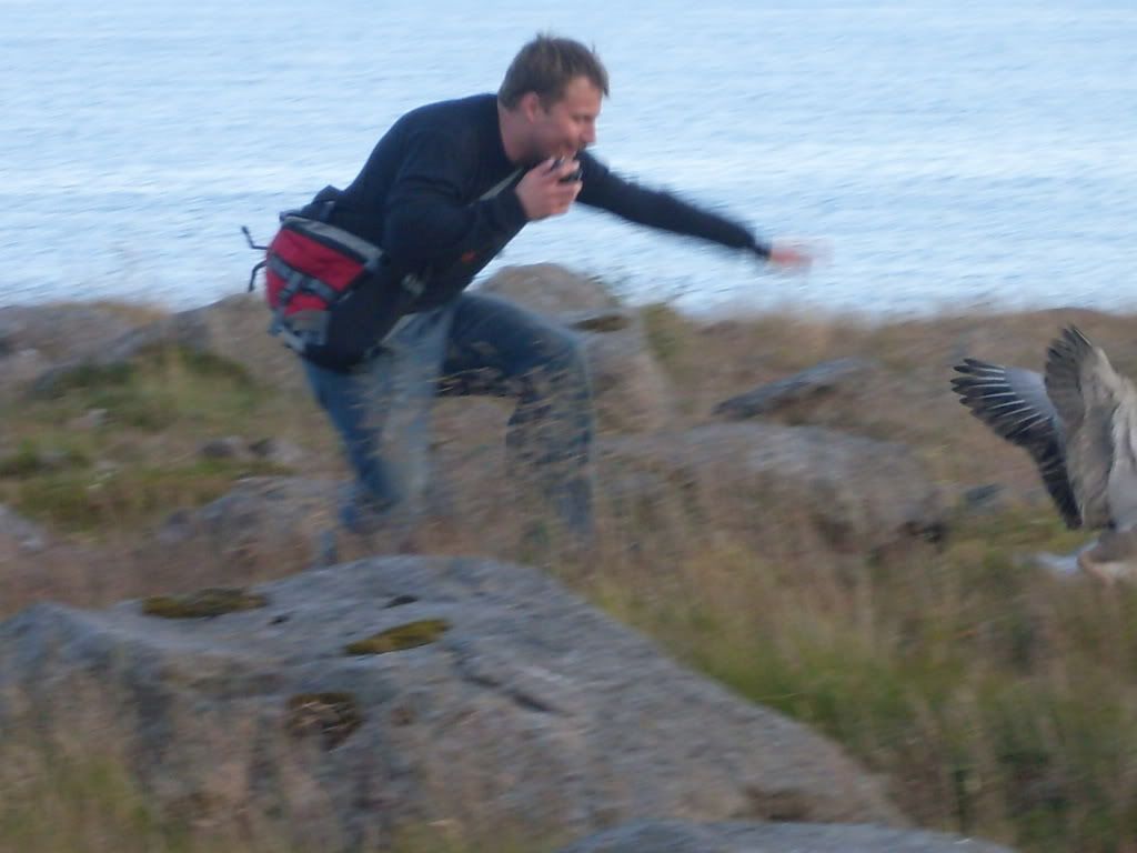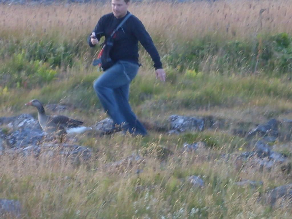 We came across a big...uh, gaggle? of these weird-looking birds. Geese, but not quite geese. They weren't big enough. They were just standing around in a field, doing what pseudo-geese do, until Jess saw them. Jess has this thing about going fucking berzerk on animals. Don't ask me why. He just does. So, Jess sees them. He doesn't utter one word, he just charges and starts screaming. I know it sounds completely retarded, but I can't do it justice with words. I've seen it a few times already too...but this one was special, because who knows how Icelandic pseudo-geese will react to a chubby drunk berzerker, right?